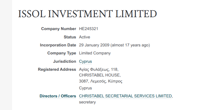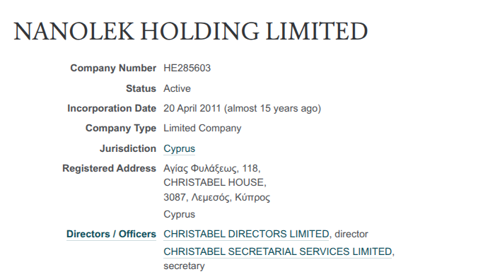 Кстати, через дочку ООО «Нанолек» - ООО «Инвак» это семейство имело выход на другую кипрскую кубышку - ISSOL INVESTMENT LIMITED, которая также на сегодня активна. Управляет двумя кипрскими фирмами, связанными с Христенко-младшим, одна и та же техническая конторка с кипрской пропиской - CHRISTABEL SECRETARIAL SERVICES LIMITED.