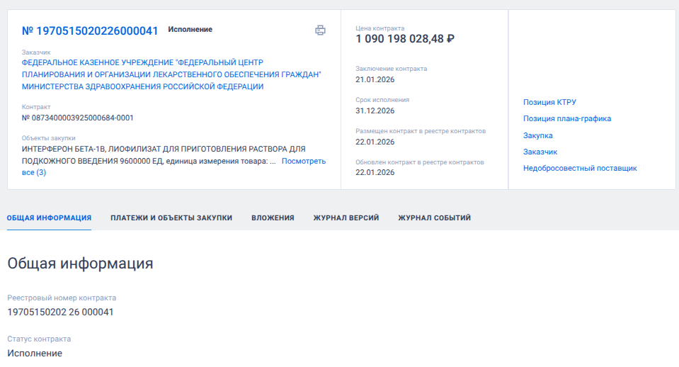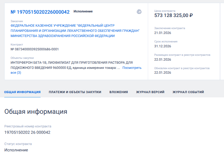 И вот, 21 января 2026 года Федеральный центр планирования и организации лекарственного обеспечения граждан Минздрава России подмахивает три госконтракта с двумя фирмами, ставшими единственными участниками тендеров: с «Нанолеком» - на 1 млрд рублей и 573 млн рублей, а также с «Фармстандартом» - на 5,2 млрд рублей.