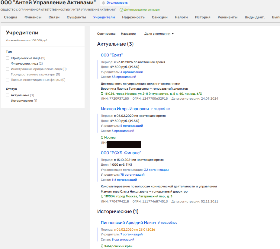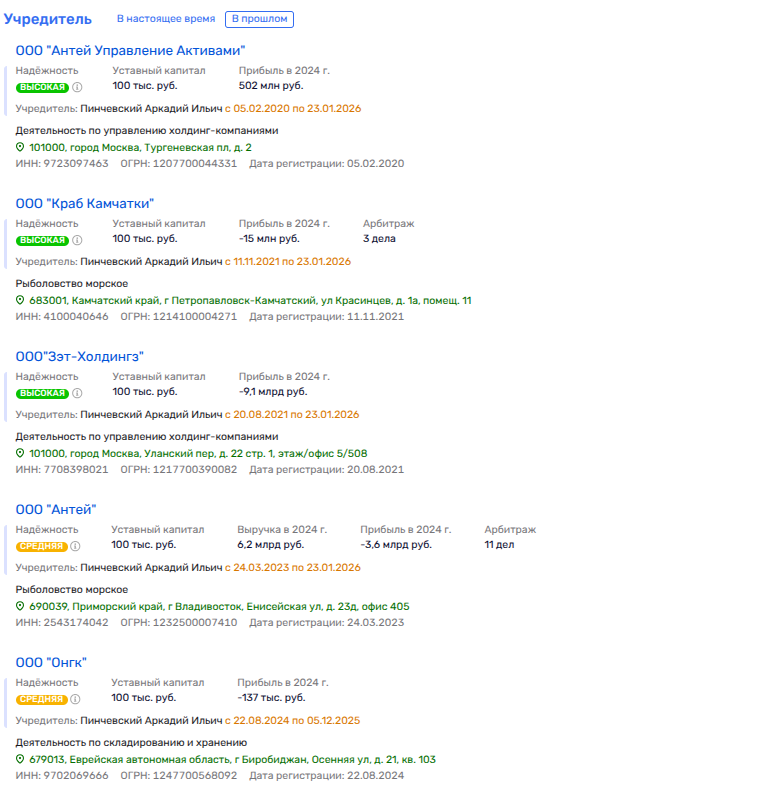 Компания «Бриз», учрежденная в сентябре 2024 года и демонстрирующая по итогам года убыток на 2,4 млн рублей, принадлежит ЗПИФ-у под управлением ООО «Северная Эгида». При этом последней Пинчевский еще в апреле 2025 года сливал ООО «Портовые проекты», через которое скупал госимущество - имущественный комплекс на ул. Бархатной, 40 во Владивостоке, в составе коего были причалы.