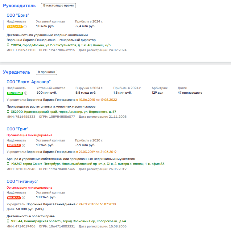 Еще один интересный факт: директор ООО «Бриз» - Лариса Воронина ранее была совладельцем компании из Ленобласти - «Титаниус», где ее партнерами выступали Татьяна и Елена Нагинские. Это родственницы бывшего замминистра обороны Григория Нагинского.