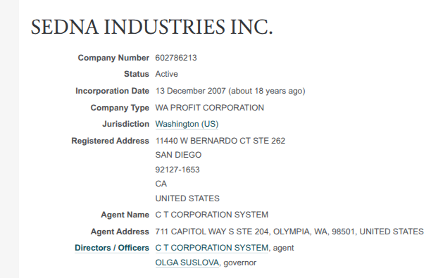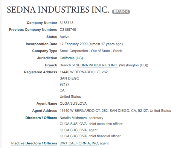 Так, в США появилась фирма SEDNA INDUSTRIES INC, существующая с пачкой клонов и по сей день. Среди руководителей - Natalia Mikhnova и OLGA SUSLOVA. Последняя - родственница Михновых, у нее также есть общий актив с Игорем и Иваном Михновыми - I.K. SEAFOOD, INC., что существовало в 2013-2016 годы.