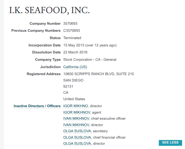 Тут стоит отметить, что некий Igor Mikhnov был связан с новозеландской фирмой KING CRAB NZ LIMITED, британской SILVER HARVESTER LIMITED, американскими WEST COAST SEAFOODS, LLC и FISH BOUTIQUE, INC.