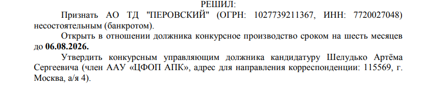 Арбитраж Москвы 2 февраля 2026 года признал банкротом и ввел конкурсное производство на шесть месяцев - 06.08.2026 года в отношении АО «Торговый дом «Перовский». Последнее выступает владельцем одноименного торгового центра на пр.Свободный, 33 общей площадью 18,2 тыс. кв.м.