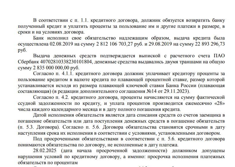 В суд пошел Сбербанк, заявив долг по кредиту почти на 3 млрд рублей.