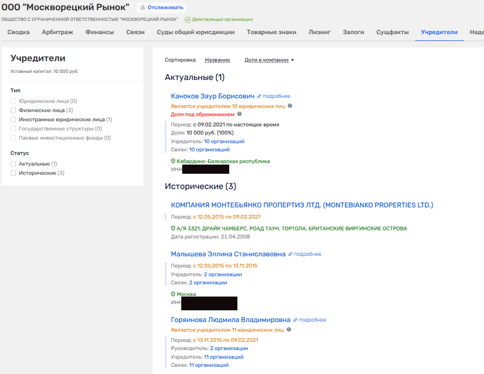 Также именно некоему Зауру Канокову отошел и «Москворецкий рынок», коим ранее владела семья Горяиновых и офшор с Британских Виргинских острово - MONTEBIANKO PROPERTIES LTD. Так может, вместе с рынком семейство получило и доступ к зарубежной кубышке, не зря же откуда-то образовалась финансовая дыра при активной сдаче помещений в аренду?