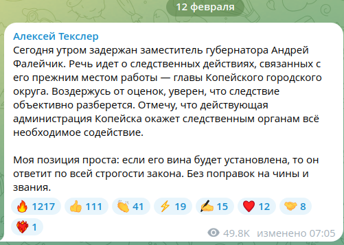 Арест курирующего строительный и инфраструктурный комплекс региона Фалейчика, пусть даже и по его работе на посту главы Копейского горкокруга, это удар по репутации самого Текслера. Ведь именно он и утверждал его на посту главы Копейска.