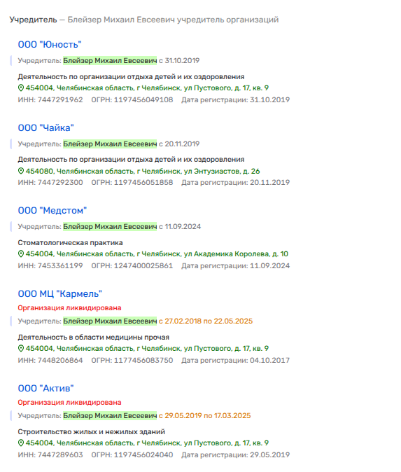 На сегодня, кроме детских оздоровительных лагерей, на Блейзере числится стоматологическая клиника Медстом, созданная в 2024 году, но уже успевшая побывать соответчиком по иску о защите прав потребителей.