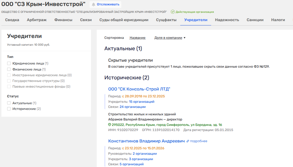 Итак, у фирмы СЗ «Крым-Инвестстрой», где Константинов прикрыл свои уши в январе 2026 года, весьма мутная биография, которая выводит на офшор из Белиза.