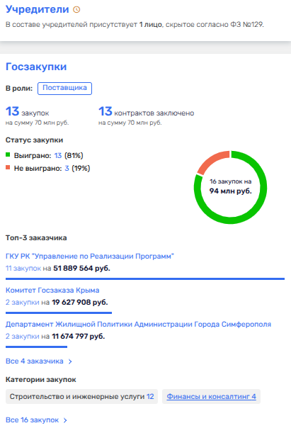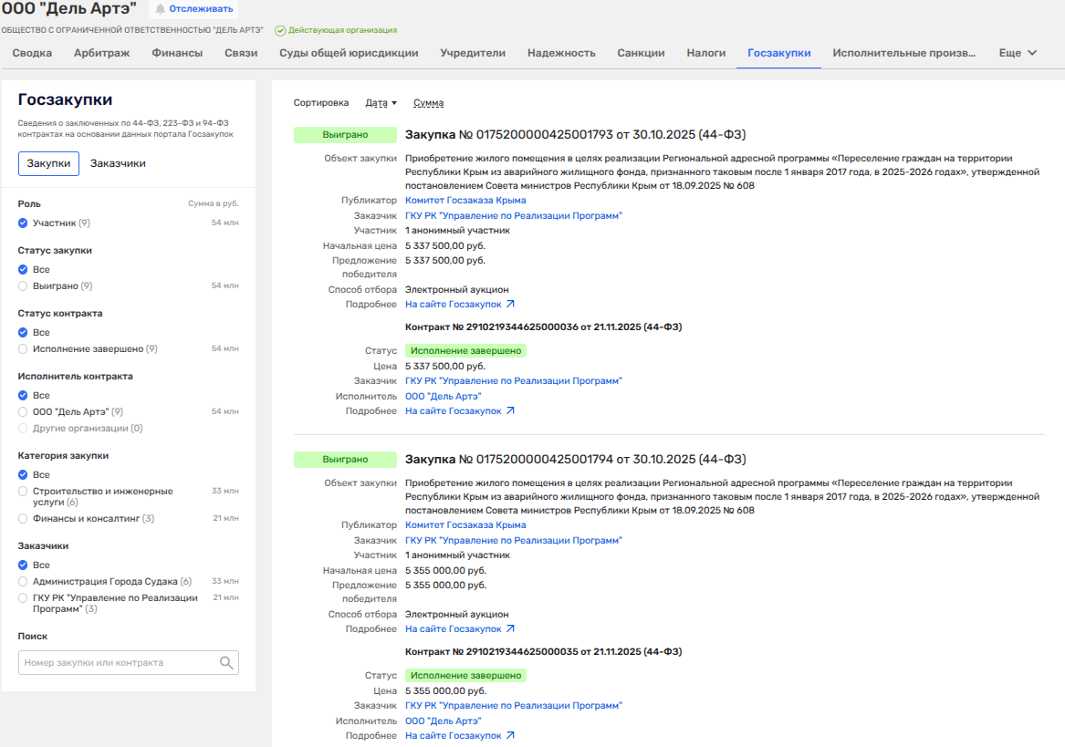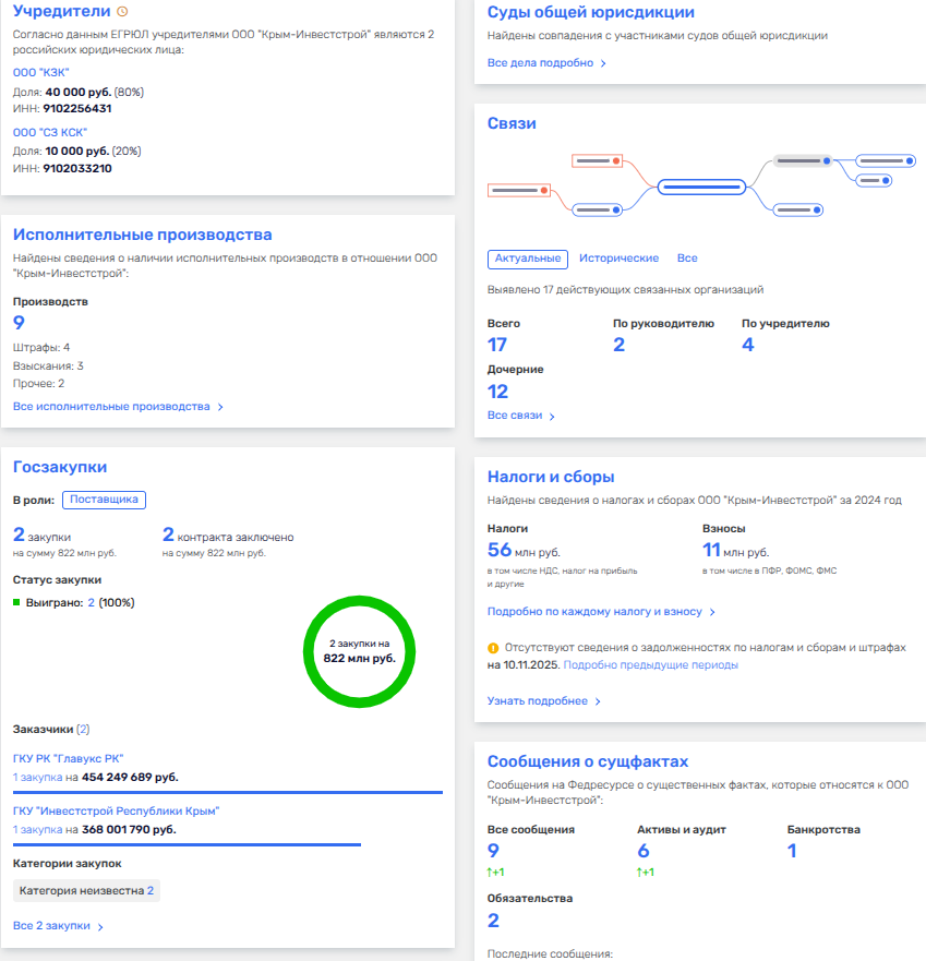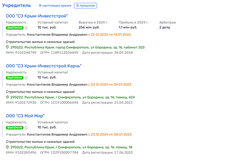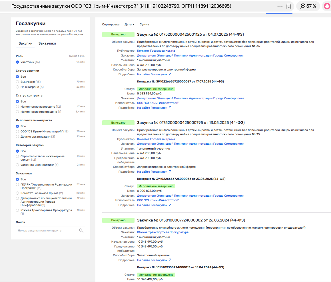 Следует отметить, что фирм-поставщиков жилья по госконтрактам в паутине бизнеса Константиновых не мало. Так, с ООО СЗ «Крым-Инвестстрой Керчь» (застройщиком ЖК В Керчи - «У двух морей») за 2025 год были подписаны тем же Управлением по реализации программ Крыма шесть госконтрактов на поставку жилья общей стоимостью почти 46 млн рублей.