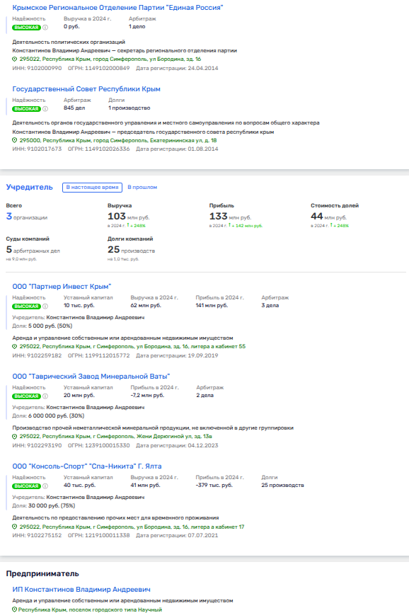 В открытом владении, даже без передачи в доверительное управление, у Константинова остались доли в ООО «Партнер Инвест Крым», «Таврический завод минеральной ваты», «Консоль-Спорт «Спа-Никита» и ИП в сфере управление недвижимостью. То, что активы не переданы в доверительное управление, это нарушение закона, но местные надзорные органы давно и плотно подзакрыли на это глаза. Но на фоне другого коррупционного следа - это уже и смотрится мелочами.