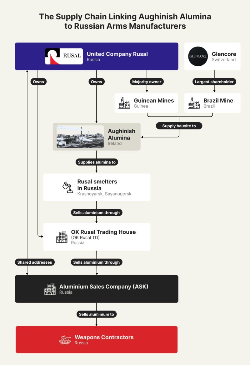 Yet rather than remaining in the European Union, the majority of the Aughinish factory’s exports are shipped to Russia’s largest aluminum smelters. Those smelters, in turn, feed into a supply chain of sanctioned defense contractors whose weapons have killed thousands of civilians in Ukraine, a new investigation by OCCRP and partners has found.