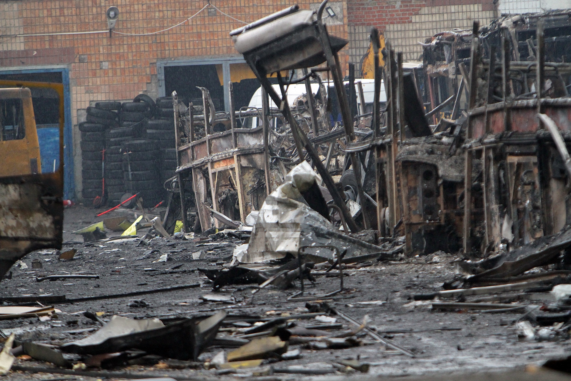 View of burnt-out buses at a transport company depot following a nighttime Russian Iskander missile strike on Dnipro in central Ukraine in September 2022.