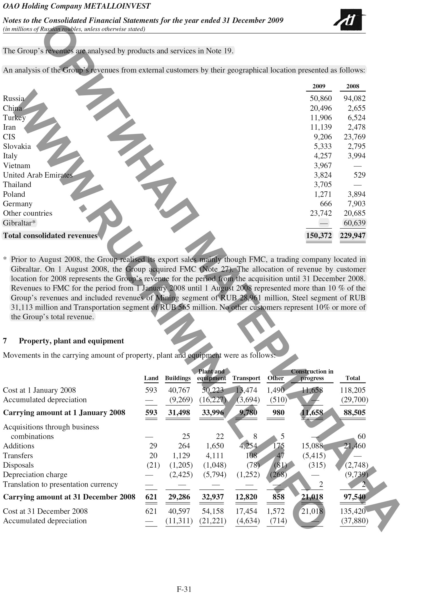 "До августа 2008 года Группа (Металлоинвест) осуществляла свои экспортные продажи в основном через торговую компанию FMC, расположенную в Гибралтаре. 1 августа 2008 г. Группа приобрела FMC (Примечание 27). Распределение выручки по местонахождению Клиента (эФэМСи) за 2008 год представляет собой выручку Группы за период с момента приобретения до 31 декабря 2008 года.