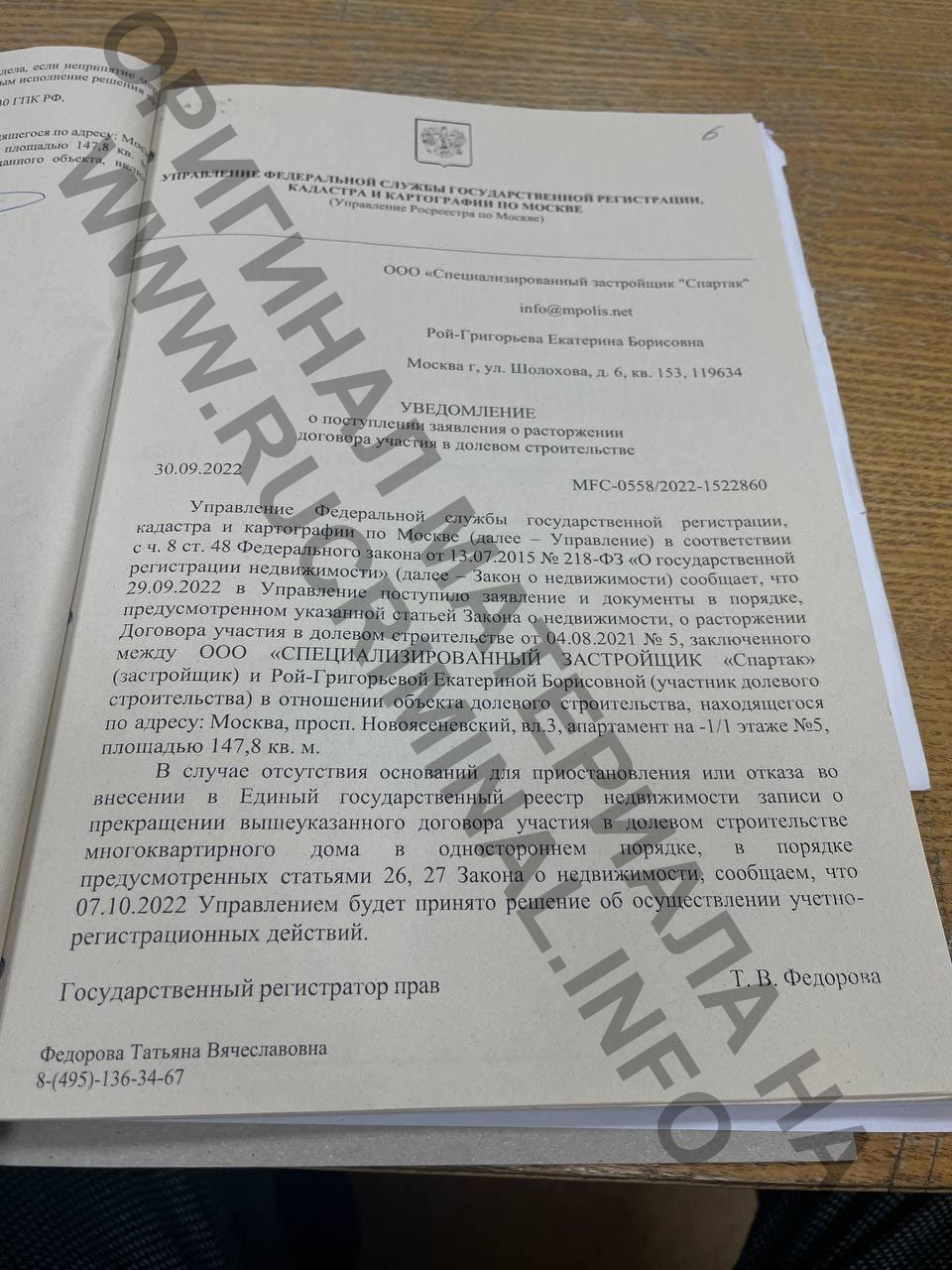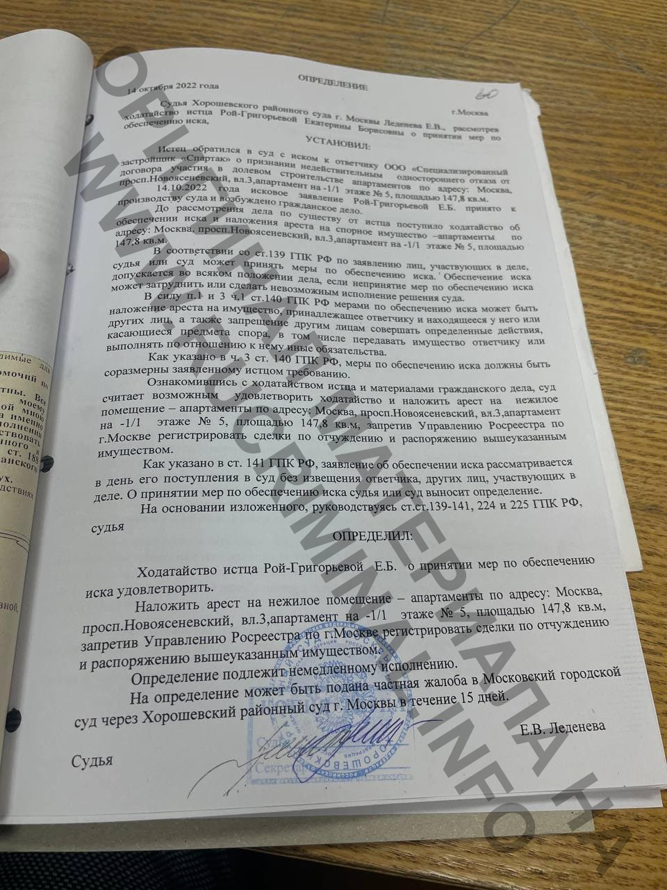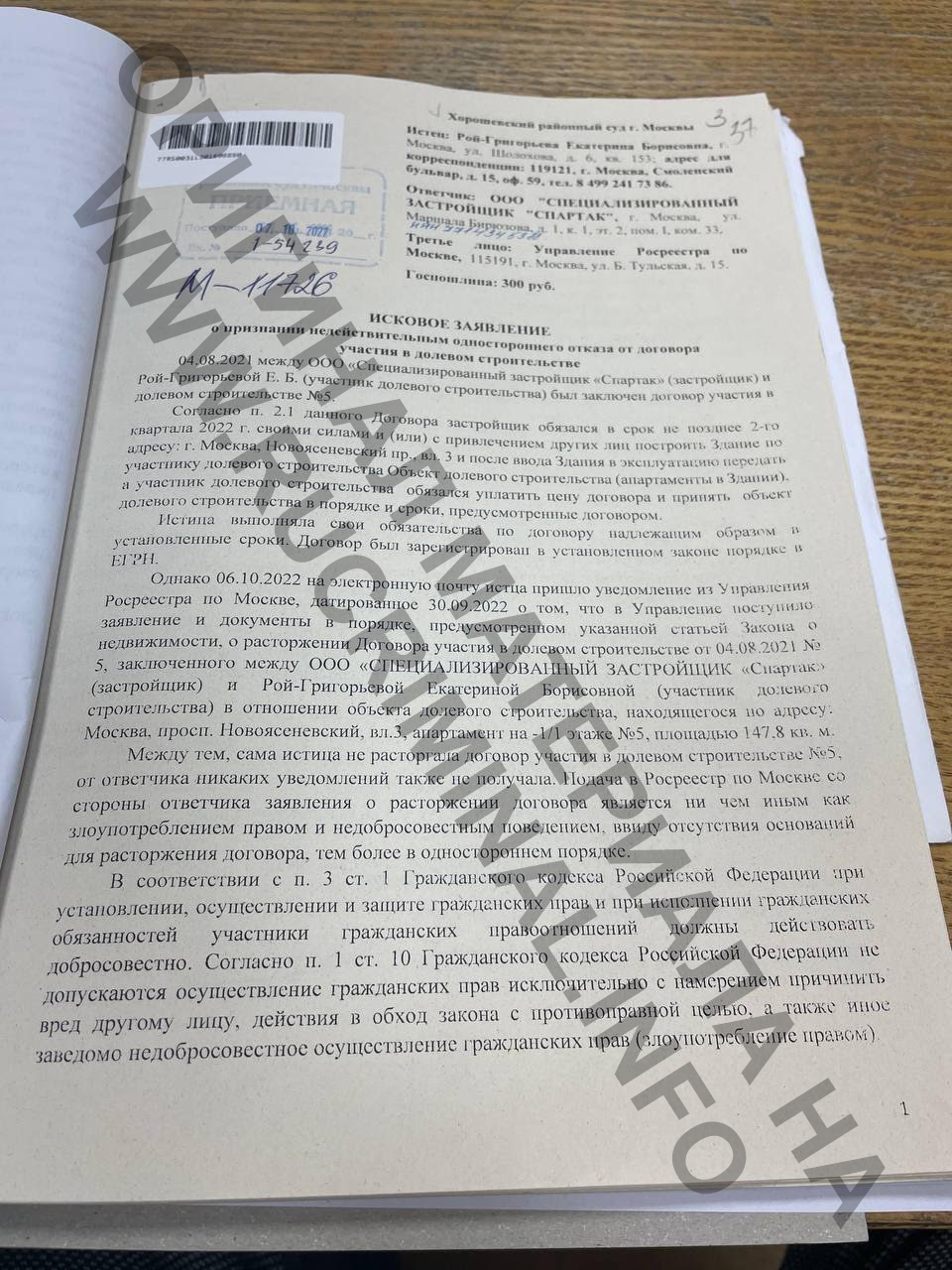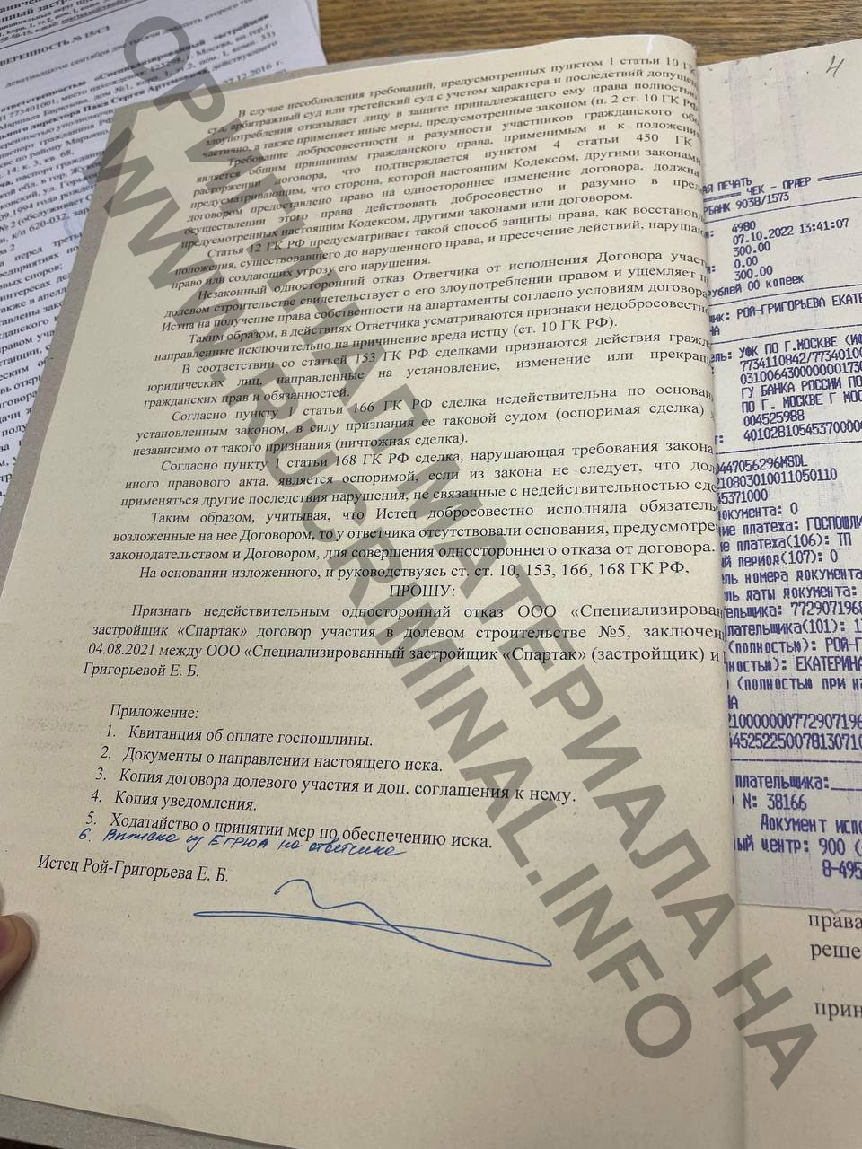 Став свидетелем былых денежных успехов своих доверителей и мужа, заработавших капиталы в том числе на недвижимости, в 2021 году Екатерина решает стать частным инвестором. Пример бывшей жены своего мужа, потерявшей миллионы на неудачливом девелопменте, её не отвратил, ведь она-то — настоящая Рой-Григорьева. Опять открываем данные реестра юрлиц и видим, что у Владимира Мухина и Александра Сысоева был не только старший партнёр по банковскому бизнесу — Алексей Чепа, но и по недвижимости — Сергей Красавин. Мухин покинул совместные бизнесы с Красавиным около 7 лет назад, а вот Сысоев продолжил совместную деятельность. Самый большой актуальный строительный проект Сергея Красавина — комплекс апартаментов бизнес-класса LES в Ясенево, рядом с Битцевским парком. По счастливой случайности, в период борьбы за взыскание пончиковых долгов, наша героиня заключает договор долевого участия на апартамент в этом ЖК площадью почти 150 квадратов за умеренную цену в 20 с небольшим миллионов рублей. Однако более чем через год после подписания, застройщик его расторгает из-за полного отсутствия оговоренных в договоре платежей. Несогласная с потерей актива Рой-Григорьева подает в Хорошевский районный суд Москвы иск. Беглое знакомство с материалами этого дела довольно чётко описывает отношение нашей героини к закону, а также нравы московского судебного сообщества. Обманутая в лучших чувствах победительница пончиков в исковом заявлении указывает, что она исполнила все свои обязательства по договору и требует признать односторонний отказ застройщика незаконным. Есть маленький нюанс: в соответствии с представленной в суд выпиской Сбербанка, по договору было оплачено 0 рублей 0 копеек, то есть адвокат намеревалась получить апартаменты даром, а когда несогласный с этим застройщик после более чем годичного ожидания платежей расторг договор — обратилась в суд. Судья Екатерина Леденева принимает заявление к производству и оперативно накладывает арест на не оплаченные Рой-Григорьевой апартаменты. То есть федеральный судья просто на слово, без единой платежки верит успешному адвокату и на основании своей веры в коллегу-юриста принимает обеспечительные меры. Дальше-больше: рассмотрение вопроса по существу переносится судьей Леденевой на полгода. В чем причина, ведь погасить многомиллионный долг по расторгнутому договору Рой-Григорьевой было бы проблематично в связи с закрытием банком счета эскроу, то есть исполнить свои обязательства, даже с огромной просрочкой, она уже не могла. Но Рой-Григорьева и не собиралась платить — просто ждала ввода комплекса в эксплуатацию. Как только объект был сдан, адвокат подала в суд измененное исковое заявление. В нём она опять указала на то, что исполнила свои обязанности по договору, хотя справка об отсутствии оплат давно приобщена к делу, а также попросила суд обязать застройщика передать ей апартаменты по передаточному акту, то есть выражаясь простым языком — подарить. Вот так человек с высшим юридическим образованием в статусе адвоката Московской городской коллегии адвокатов подает в суд заявление, гласящее что единственным обязательством дольщика новостройки является подписание договора, а платить по нему для оформления права собственности совсем не обязательно. И человек с высшим юридическом образов