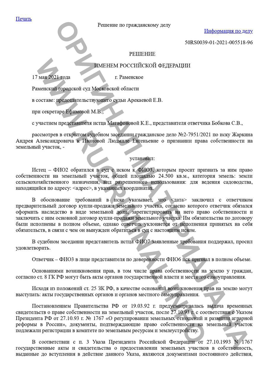 Общей площадью почти 8 ГА в водоохранной зоне Москва-реки, в 20 км от МКАД рыночной стоимостью почти 1,5 млрд. рублей стали частной собственностью с ВРИ «Для ведения гражданами садоводства и огородничества». Одно то обстоятельства, что по всем участкам рассматривала разные административные дела и выносила решение одна и та же судья, уже попахивает коррупционной составляющей, учитывая тот факт, что в наших судах давно уже дела распределяются компьютером и в случайном порядке. По крайней мере, так должно быть. В мотивировочной части самих решений алгоритм изъятия госсобственности примитивен до неприличия: истец, якобы, заключил с ответчиком предварительный договор купли-продажи земельного участка, согласно которого ответчик обязался оформить наследство в виде земельной доли, зарегистрировать на него право собственности и заключить с ним основной договор купли-продажи земельного участка. Дальше ответчик, якобы, от исполнения принятых на себя обязательств уклонился, в связи с чем Истец обратиться в суд. Дальше идут сплошные «поддавки»: представитель ответчика исковые требования признает полностью и просит суд экспроприировать «его собственность», кстати «проданную» за символическую цену: примерно по 2000 рублей за сотку, при том, что рыночная стоимость сотки в этом районе от 250000 руб. Причём все доли, которые упоминаются в решениях, были оформлены на давно умерших людей. Дальше ещё интересней: судью не смутил тот факт, что земельные паи, на основании которых судья вынесла решения, расположены в одном поселении, а решение выносится на земельные участки в другом! Основываясь на фальшивых заключениях кадастровых инженеров и поддельных доказательствах, без привлечения в суд в качестве заинтересованных лиц — представителей администрации городского округа, министерства имущественных отношений Московской области, не запросив даже их письменное мнение, из которого она бы узнала, что данные земельные участки НИКОГДА не относились к сельхозземлям, а ещё со времен СССР относились к категории «земли населённых пунктов». Узнала бы судья Арекаева и о том, что в соответствии с утверждёнными ПЗЗ эти участки относятся к территориальной группе О-4 «зона объектов отдыха и туризма», но Фемиду этот факт тоже не смутил и из чего можно смело сделать определенные выводы о серьёзной коррупционной подоплеке, стоящей за этими судебными решениями и они, вероятнее всего, могут серьёзно отразиться на служебной карьере судьи Арекаевой т.к. в настоящее время по этой мутной истории уже ведётся проверка Главным управлением МВД по М.О.