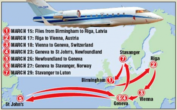 | Cамолет бизнесмена Рожецкина уже после его исчезновения 15 марта совершил несколько полетов внутри Европы. Иллюстрация Mail on Sunday ( www.dailymail.co.uk). |