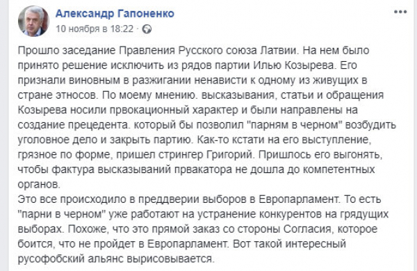 Сразу после исключения Ильи Козырева, которое состоялось в субботу, 10 ноября, на своей странице в Facebook заметный член Русского союза Латвии Александр Гапоненко сделал следующее заявление, которое цитируем с сохранением авторской орфографии и пунктуации: