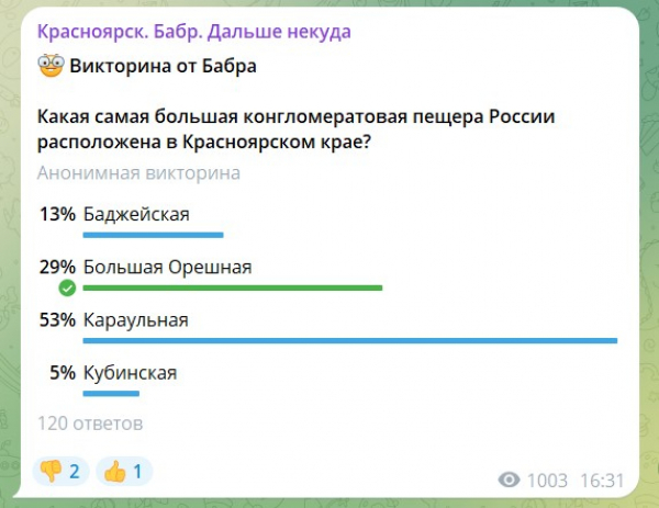 Настало время подвести итоги викторины, которую Бабр проводил в минувшие выходные в своём телеграм-канале «Красноярск. Бабр. Дальше некуда». На этот раз Бабр решил выяснить, знают ли подписчики самую большую конгломератовую пещеру России, которая расположена в Красноярском крае. Возможно, не все участники викторины внимательно читали вопрос, потому выбирали вариант ответа «Караульная». Эта пещера считается самой протяжённой пещерой края, но не является конгломератовой.