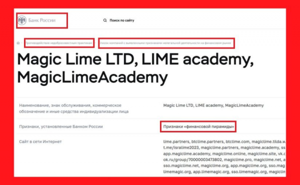 ЦБ ещё в 2021 году включил одно из названий этой структуры в свой чёрный список. Речь о Magic Lime LTD (LIME academy, MagicLimeAcademy)