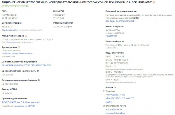 Итак, "РТ-капитал", который занимается реализацией непрофильных активов госкорпорации "Ростех", выставил на продажу 100% акций АО "Научно-исследовательский институт вакуумной техники им. Сергея Векшинского".