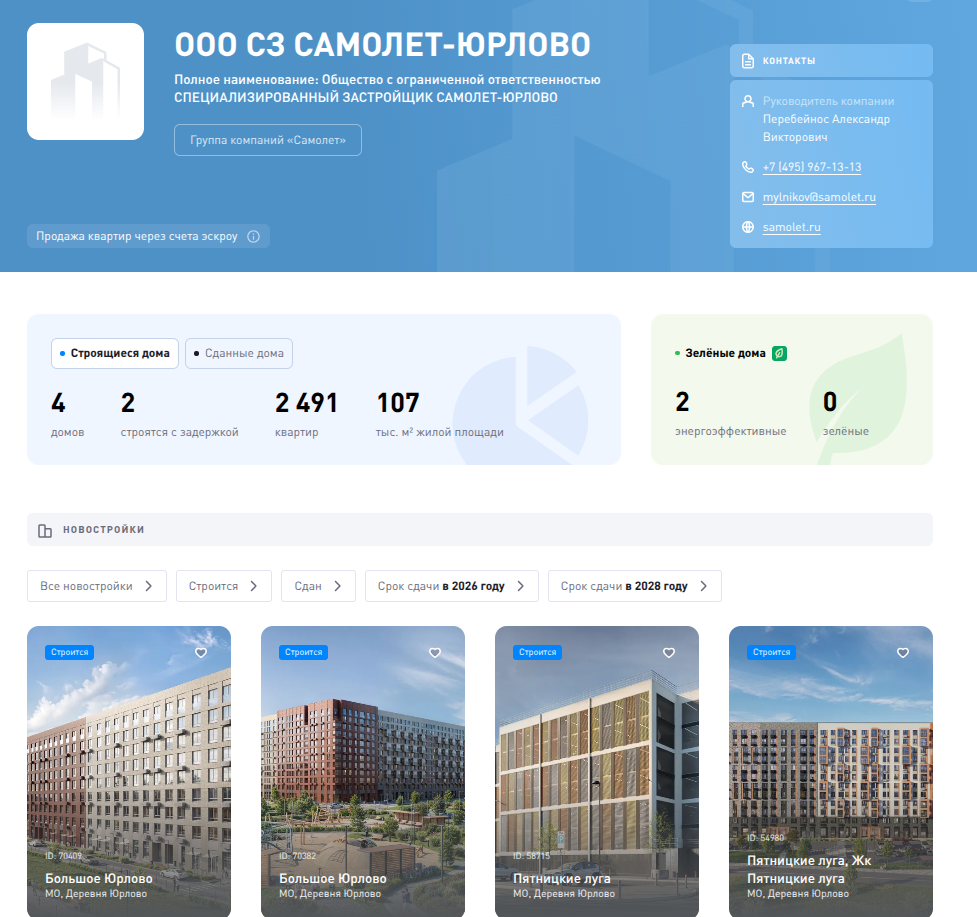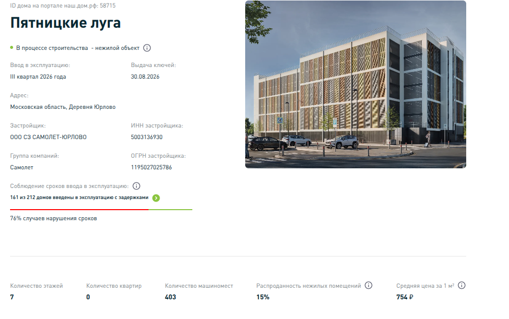 Единая система жилстроительства прямо сообщает, что в ГК «Самолет» 161 из 212 домов введены в эксплуатацию с задержками, то есть сроки срывали в 76% случаев. Такая себе рекомендация для застройщика.