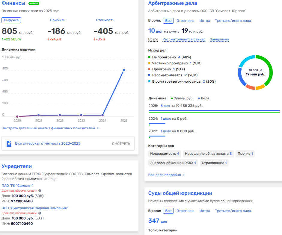 Ведь и само ООО СЗ «Самолет-Юрлово» - это убыточная шарашка с чистым убытком 186 млн рублей за 2025 год, при том, что выручка была 805 млн рублей. Еще более нескромные итоги у подрядчика проект из того же дивизиона - ООО «Жилстрой-Мо», что по итогам 2025 года показало убыток на 438 млн рублей. Деньжата пошли на дивиденды поиздержавшимся акционерам в лице брата губернатора Подмосковья Максима Воробьева и Ко?