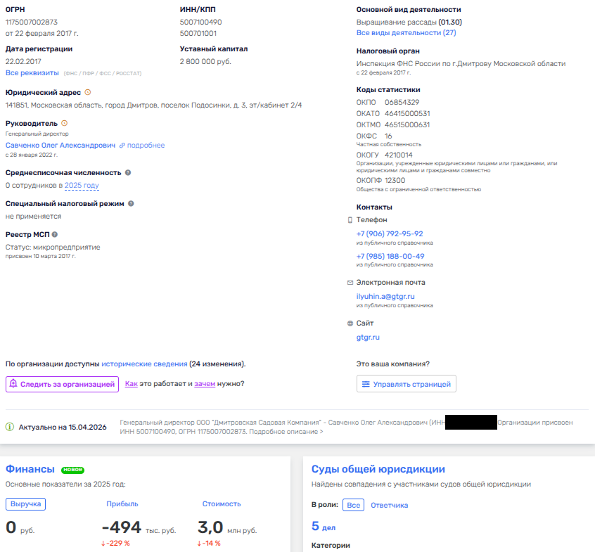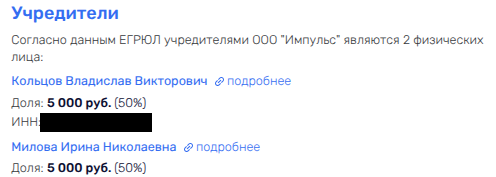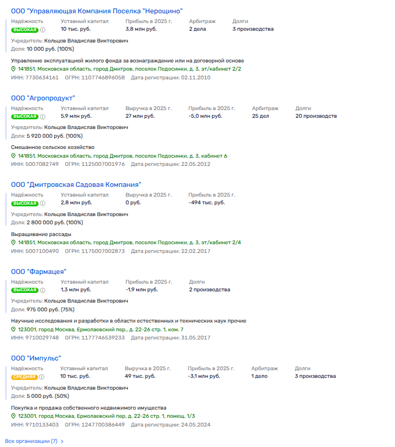 При этом у фирмы была нулевая выручка, убыток на 494 тыс. рублей и 0 сотрудников в штате. Владельцем там некий Владислав Кольцов.