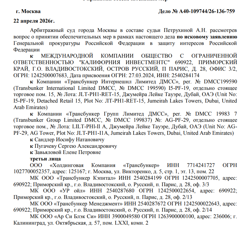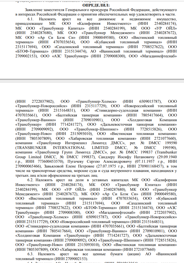 Арбитраж Москвы 5 июня рассмотрит иск Генпрокуратуры к ванинским топливным олигархам из дивизиона нефтеперевалочного предприятия «Трансбункер» - Сергею Пугачеву и Иосифу Сандлеру, которые создали выводную кубышку с многочисленными офшорами и кипрскими юрлицами. Прокурор оспаривает некие сделки и, вероятно, будут применены последствия. Пока не ясно, какие из активов требуют передать на баланс государства, но наличие в деле многочисленных иностранных юрлиц на это намекает. Более того, наложены аресты на десятки фирм, включая акции АО «Ванинский топливный терминал».