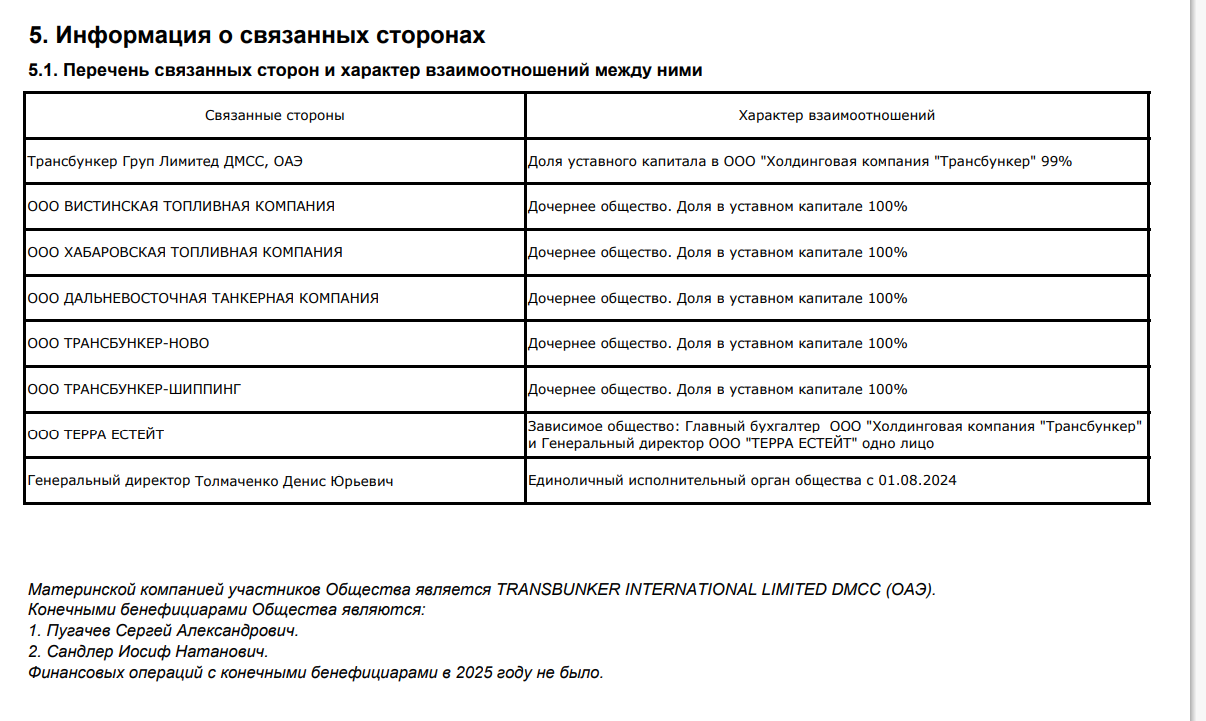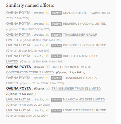Что занятно, МК ООО КАЛИФОРНИЯ ИНВЕСТМЕНТС - это бывшее кипрское CALIFORNIA INVESTMENTS CORPORATION CYPRUS LIMITED, где руководителями были все тот же Сандлер, Пугачев и некая ΟΛΕΝΑ ΡΟΥΤΑ, на которую оформлен еще с десяток кипрских компаний. При этом именно эта мадам с кипрским паспортом рулит созданным в 2021 году CALIFORNIA INVESTMENTS CORPORATION CYPRUS LIMITED и учрежденным еще в 2002 году TRANSBUNKER TRADING LIMITED. Она же была директором ликвидированного в 2025 году MILANOVA HOLDING LIMITED, которое фигурировало как акционер АО «Ванинский топливный терминал».