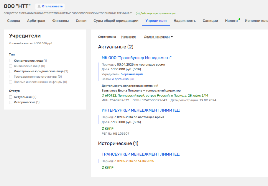 При этом МК ООО «Трансбункер менеджмент», скрывающему своих владельцев, а по факту сляпанному из кипрского аналога - Transbunker Management Limited - и прописанному в русском офшоре на о. Русский (Приморье) принадлежат компании в Новороссийске, Санкт-Петербурге, на Сахалине, причем некоторые активы имеют в совладельцах вполне себе живые кипрские кубышки. Например, в ООО «Новороссийский топливный терминал» с оборотом в треть миллиарда рублей долю имеет кипрское INTERBUNKER MANAGEMENT LIMITED, учрежденное еще в 99-м году. В то же время в США также есть фирма со схожим названием - INTERBUNKER MANAGEMENT, LTD.