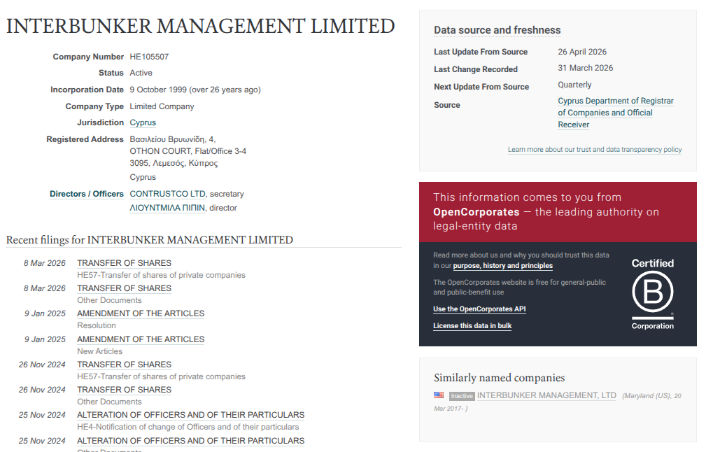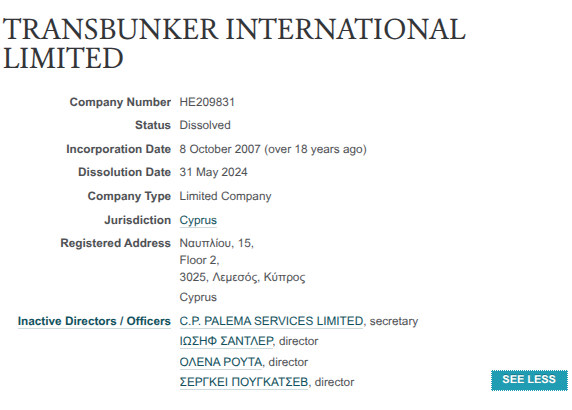 Далее капитан судна вышел на владельца флота, и тот направил танкер на Кипр. Там груз успешно приняли в «некую» компанию под названием Limmoil, если быть точным — LIMMOIL TRADING CO. LIMITED. Любопытная деталь: кипрский секретарь у этой конторы числился тот же самый, что и у большинства офшорных «кубышек», привязанных к Трансбункеру. А чтобы лишних вопросов не возникло, саму Limmoil аккуратно ликвидировали в 2014-м, старательно подметая за собой.